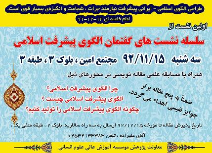اولین نشست گفتمانی الگوی پیشرفت اسلامی در مؤسسه آموزش عالی علوم انسانی در روز سه شنبه پانزدهم بهمن ماه 1392 برگزار می شود.