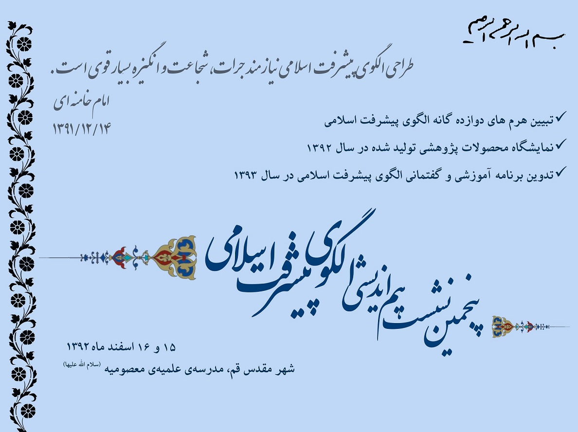 به فضل الهی پنجمین نشست هم اندیشی الگوی پیشرفت اسلامی در روزهای پانزدهم و شانزدهم اسفند ماه 1392 در شهر مقدس قم برگزار گردید.